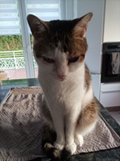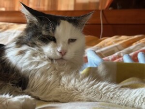 Il me regardait l'air fatigué et triste pendant que je lisais le contenu, et lorsque je me suis arrêtée, il s'est mis à pousser quelques petits miaous très discrets pour me dire :